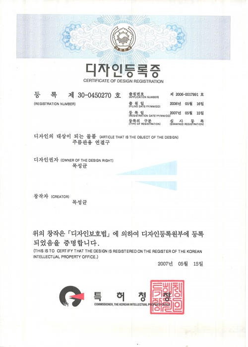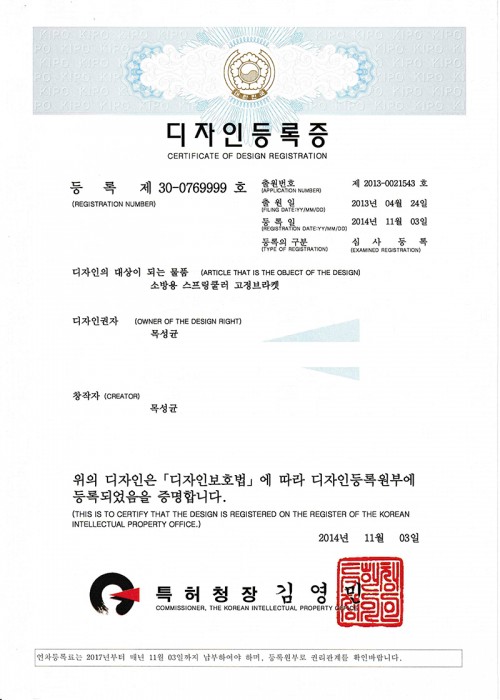 디자인등록증 30-0769999 소방용 스프링쿨러 고정브라켓