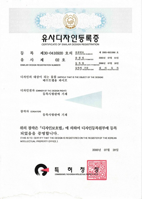 유사디자인등록증 30-0416920호의 02호 배수트랩용 파이프